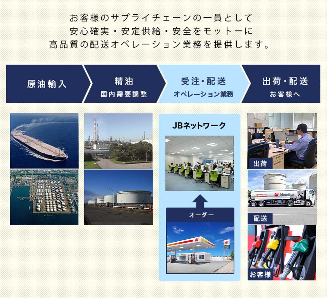 JBネットワーク株式会社は石油・LPG業界における物流機能の一角を担う物流会社として、高品質な石油配送の総合オペレーション業務を提供しています。